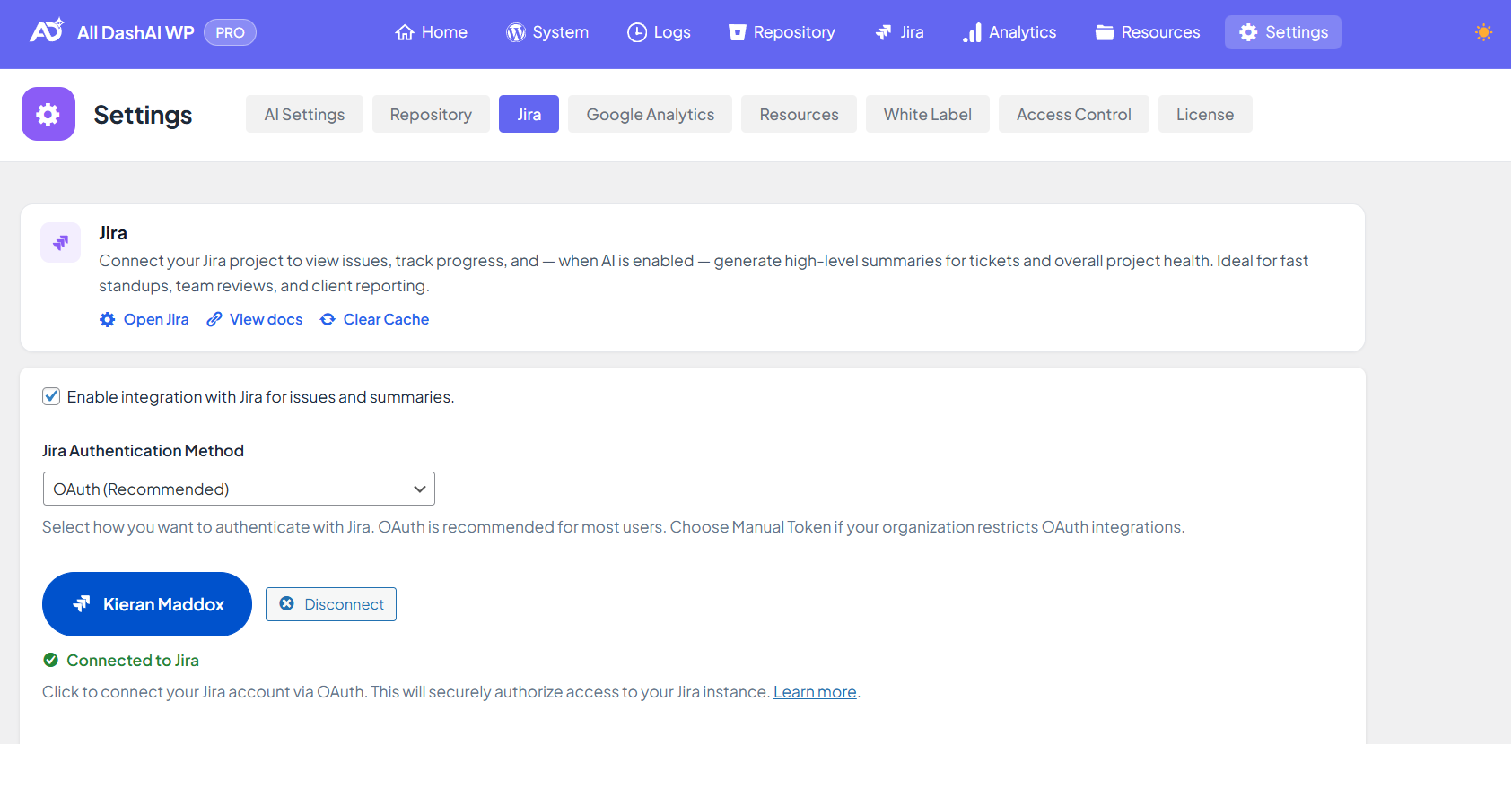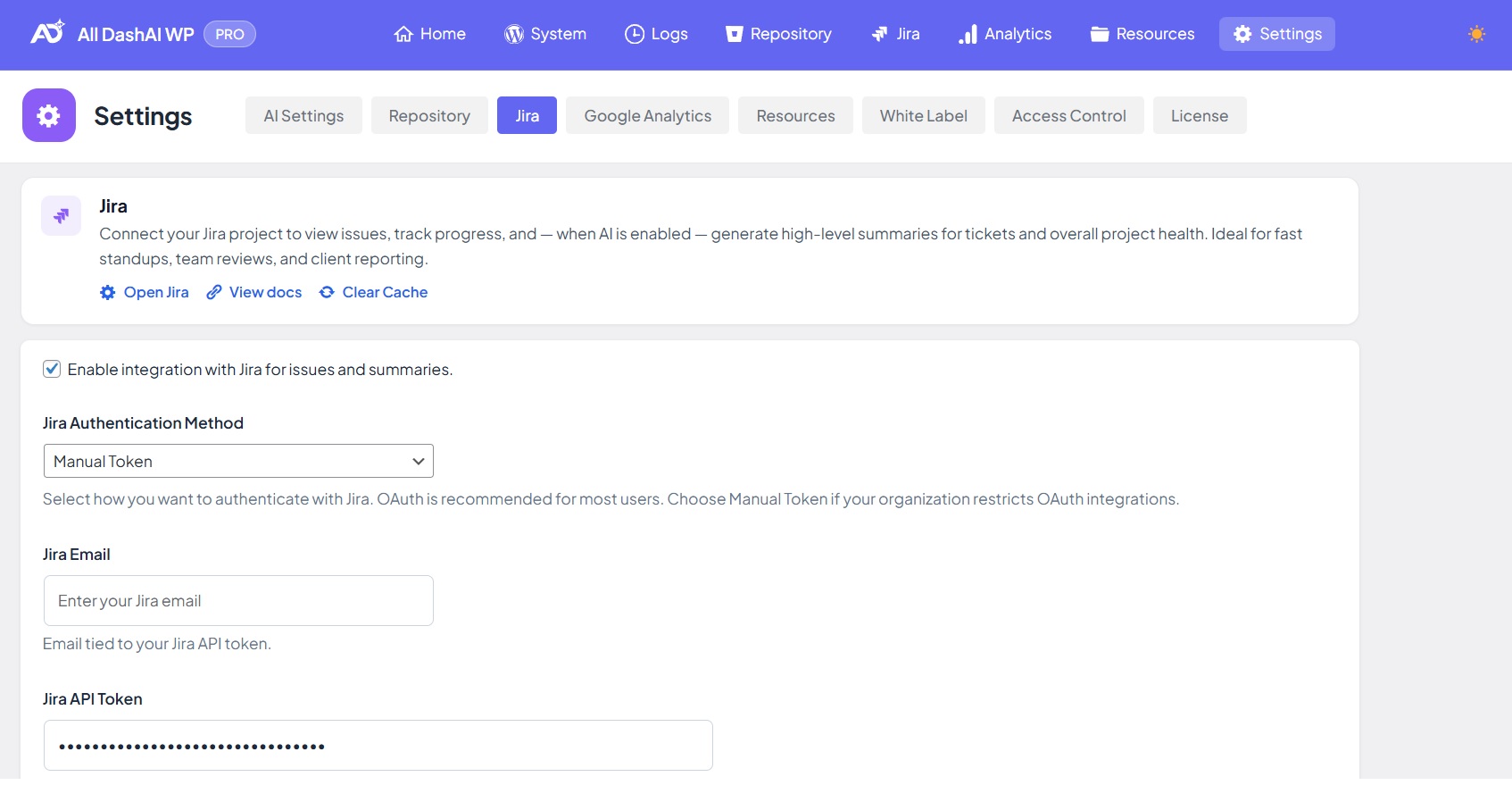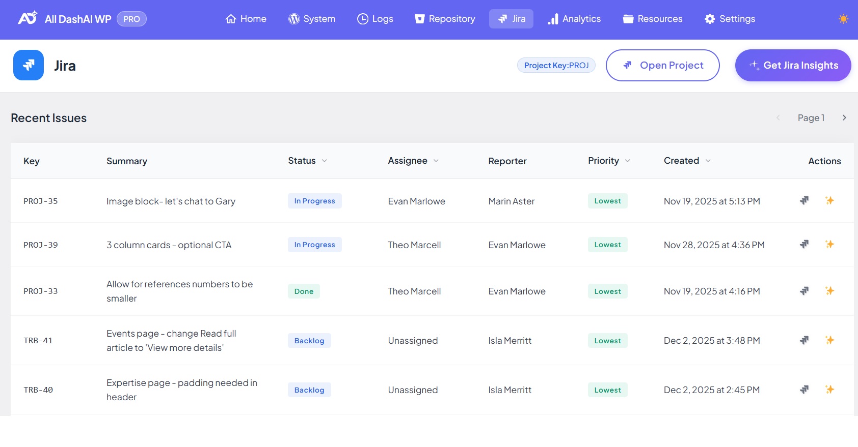 The Jira module allows All DashAI WP to fetch and display issues from your Jira Cloud projects directly inside WordPress. It provides fast access to project activity, workload visibility, and AI-powered insights, making Jira reviews significantly faster for agencies and technical teams.
