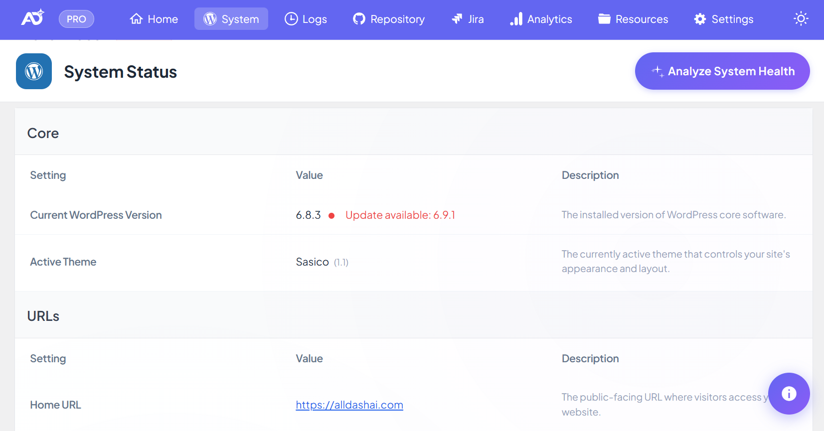 System is enabled by default. It reads your WordPress environment locally and displays a single-page snapshot when you open the dashboard.